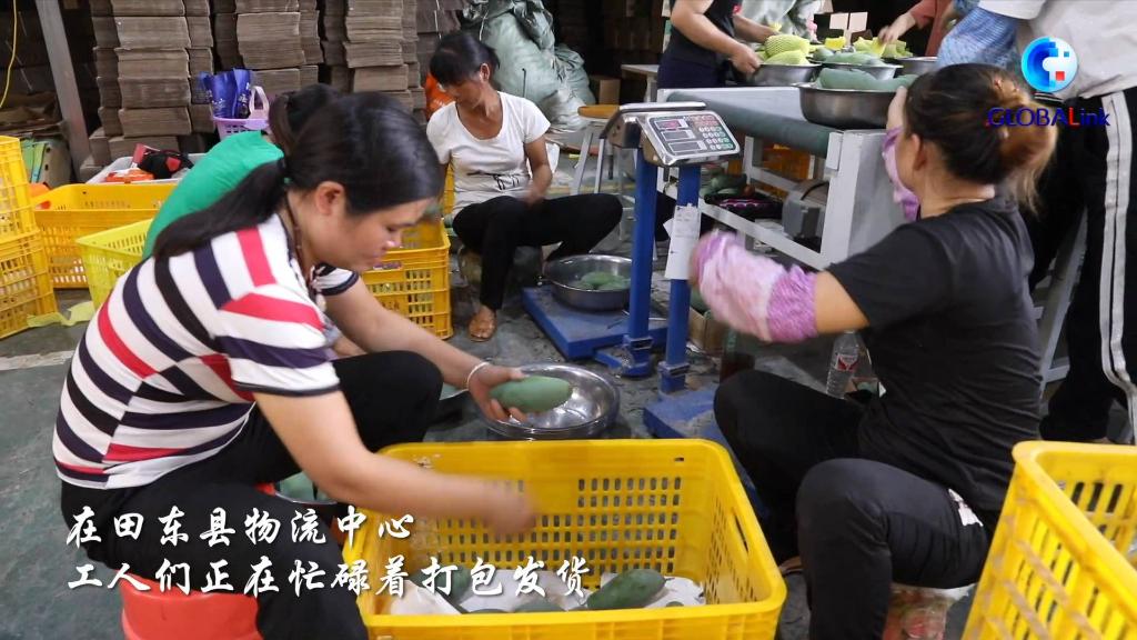 田東縣目前有3000多個電子店鋪銷售芒果,網絡覆蓋全國。在田東縣物流中心,工人們正在忙碌著打包發貨。農村電商的蓬勃發展不僅為像黃尚善一樣的返鄉青年提供創業機遇,也提供了更多的就業機會。