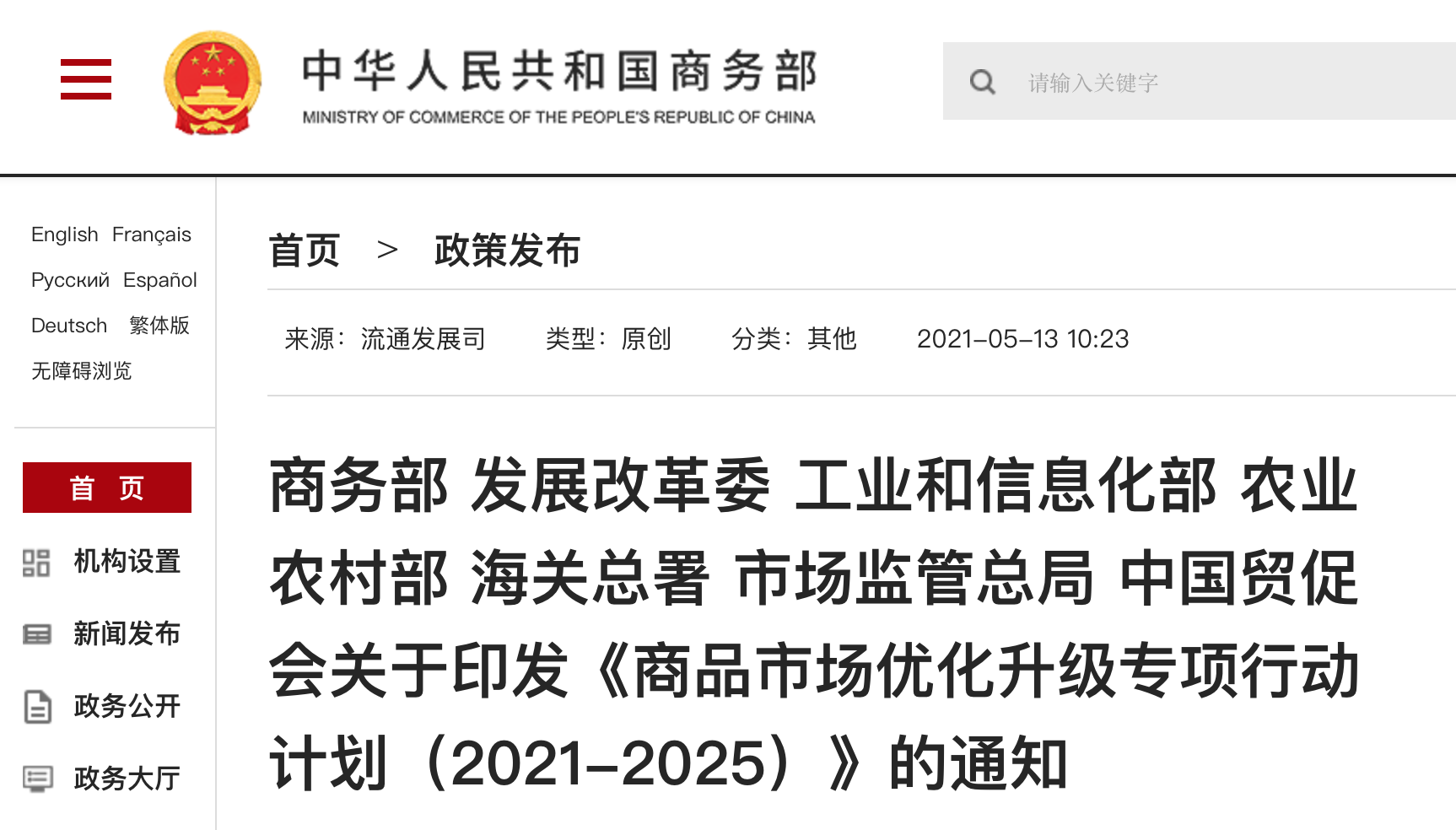 央廣網(wǎng)北京5月13日消息(記者 張圣琪)據(jù)商務(wù)部網(wǎng)站5月13日消息,為深入貫徹落實(shí)《中共中央國(guó)務(wù)院關(guān)于新時(shí)代加快完善社會(huì)主義市場(chǎng)經(jīng)濟(jì)體制的意見》《中共中央辦公廳國(guó)務(wù)院辦公廳關(guān)于印發(fā)<建設(shè)高標(biāo)準(zhǔn)市場(chǎng)體系行動(dòng)方案>的通知》等文件精神,推進(jìn)商品市場(chǎng)創(chuàng)新發(fā)展,暢通國(guó)內(nèi)大循環(huán),促進(jìn)國(guó)內(nèi)國(guó)際雙循環(huán),商務(wù)部、發(fā)展改革委、工業(yè)和信息化部、農(nóng)業(yè)農(nóng)村部、海關(guān)總署、市場(chǎng)監(jiān)管總局、中國(guó)貿(mào)促會(huì)聯(lián)合制定了《商品市場(chǎng)優(yōu)化升級(jí)專項(xiàng)行動(dòng)計(jì)劃(2021-2025)》(下稱“《行動(dòng)計(jì)劃》”)。