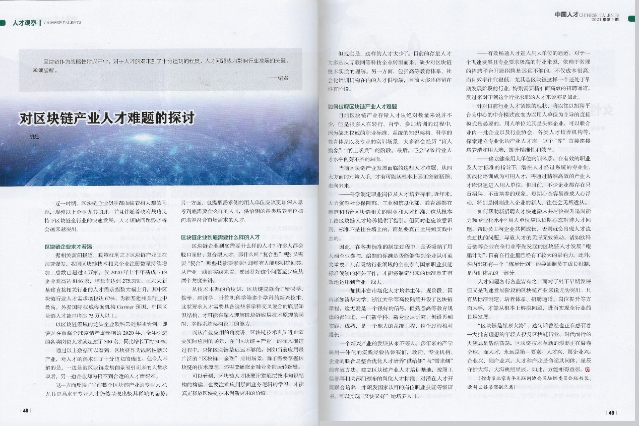 近日,中央人才工作協調小組辦公室主辦的《中國人才》雜志刊發題為《對區塊鏈產業人才難題的探討》的文章,基于我國區塊鏈產業人才現狀,分析了區塊鏈企業到底需要什么樣的人才,提出了破解區塊鏈產業人才難題的四大對策。