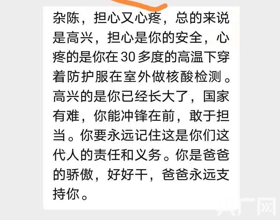 那天的核酸采樣工作直到凌晨三點才結束,胡洋洋回到家中已經是凌晨四點多。但沒想到,一向沉默寡言的父親,不僅一直在等著自己,還留下了一段話。
