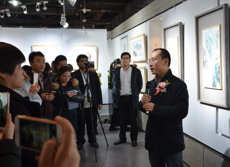 邵曉峰向現場參觀畫展的市民介紹中國潑彩山水畫