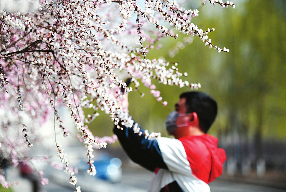 3月16日,在太原市沙河沿岸,一株株杏樹上杏花迎風開放,市民正駐足觀賞。在省城大街小巷、大小游園里,迎春、玉蘭、山桃等植物正值花期,花紅柳綠,龍城展現出嶄新的魅力與活力。(記者 寇寧 攝影報道)