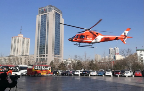 2月7日上午10時許,一架橘紅色空中救援直升機徐徐降落在太原市南宮廣場,醫務人員迅速將“車禍傷者”抬上直升機……