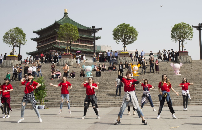 團員青年們5月4日下午在鐘鼓樓下沉廣場以“快閃”的方式慶祝五四青年節。西安晚報首席記者王健 攝