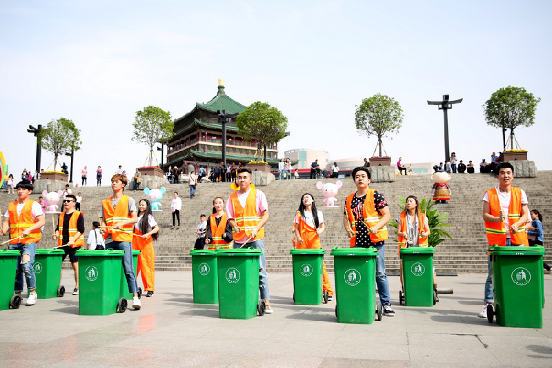 西安新聞網訊(文記者張松)鐘樓金花廣場今日行人如織。突然,十個綠色的垃圾桶被搬進了廣場。圍觀的群眾正在納悶把垃圾桶搬進廣場干什么?這時,十名身穿黃色保潔衣服的青年男女,用木棍在垃圾桶上敲打起來,奏響了美妙的樂章。