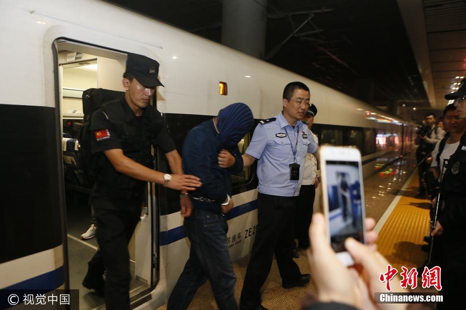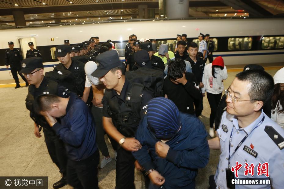 •   9月4日晚11時許,隨著列車緩緩進站,25名犯罪嫌疑人從哈爾濱押解回西安。據該局相關負責人介紹,押解時間長達一天一夜,為防止嫌疑人自殘或脫逃,押解民警將自己和嫌疑人拷在一起。目前,這25名嫌疑人因涉嫌網絡詐騙,已被公安航天分局立案調查,目前案件還在偵辦中。張杰攝 圖片來源:視覺中國