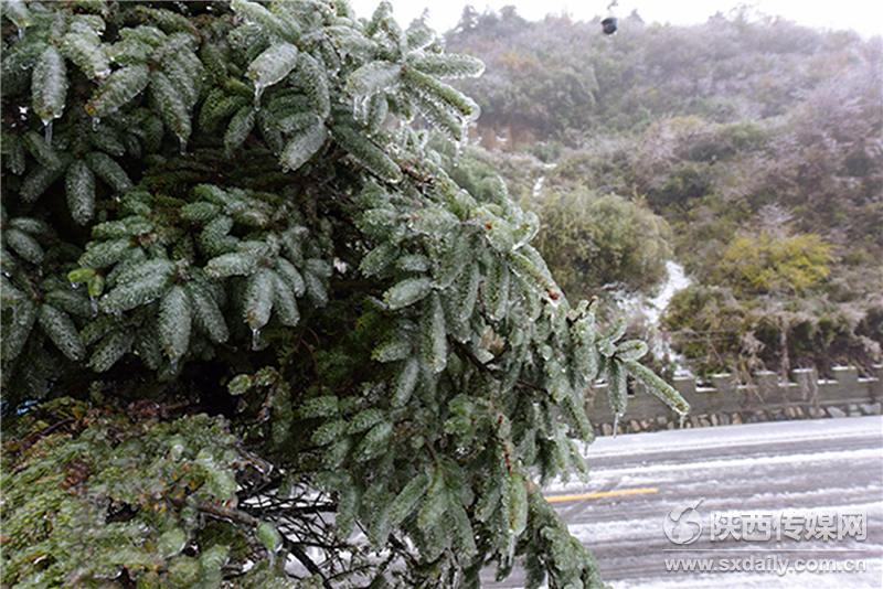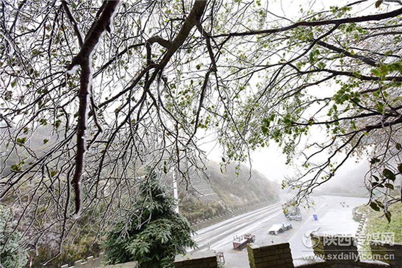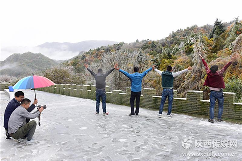10月10日,在位于西安市長安區210國道秦嶺分水嶺,急劇的降溫、持續的秋雨,不但降下一場雪,還使這里的樹木上出現晶瑩剔透的冰掛景觀,很多市民紛紛趕來,目睹這一難得自然勝景。陜西日報記者 袁景智攝 -