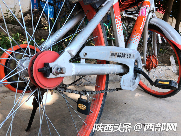 一輛摩拜單車車鏈條上被掛上了門鎖。