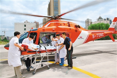 7月18日上午12時許,一架紅色救援直升機穩穩地降落在唐都醫院救援基地,該院醫務人員安全快速護送,將從200公里外轉運來的患者速送急診科。