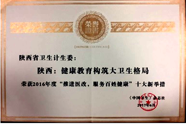 寶雞市、子長縣被國務院表彰為全國公立醫院綜合改革成效較為明顯的市、縣,同時被國務院醫改辦確定為第一批公立醫院綜合改革示范市、第二批公立醫院綜合改革示范縣。延安市醫療集團做法被國務院醫改辦向全國推廣。我省通過健康教育和健康促進,構建大衛生大健康格局的做法,被評為全國2016年度“推進醫改、服務百姓健康”十大新舉措之一。