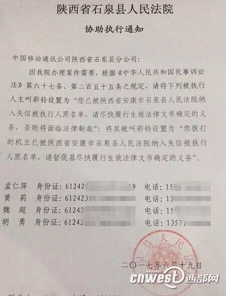 西部網(wǎng)訊(記者李媛 通訊員焦軍 尚君)“您撥打的機(jī)主已被陜西省安康市石泉縣人民法院納入失信被執(zhí)行人黑名單,請(qǐng)督促其盡快履行生效法律文書確定的義務(wù)”。這樣的彩鈴您從來沒聽過吧!今后,這樣的彩鈴您在生活中或許就會(huì)遇到。石泉縣人民法院近日被安康市中級(jí)人民法院指定為“通信限制”試點(diǎn)法院,分別與石泉縣移動(dòng)、電信、聯(lián)通三大通信公司協(xié)商一致,將通過發(fā)送《協(xié)助執(zhí)行通知書》的方式請(qǐng)三大通信公司協(xié)助執(zhí)行,在陜西全省率先對(duì)“老賴”實(shí)施通信限制。