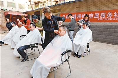 南院門街道印花布園社區工會聯合會開展“弘揚雷鋒精神 志愿服務社會”主題活動,邀請志愿者為轄區文明引導員、保潔員、居民群眾義務剪發。 記者 竇翊明攝