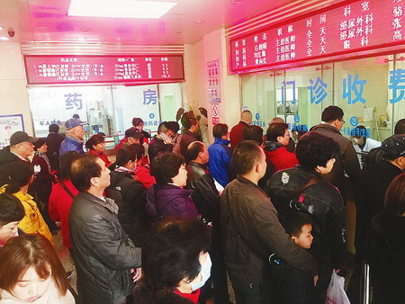 在解放軍第四五一醫(yī)院的掛號(hào)窗口前,前來(lái)就醫(yī)的群眾正在排隊(duì)。