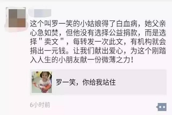去年一篇題為《羅一笑,你給我站住》的微信文章傳遍朋友圈。文內(nèi)父親羅爾稱5歲女兒羅一笑患白血病,治療費用平均每天上萬元,急需救命、懇求捐款。此文章在朋友圈瘋傳兩天羅爾獲捐270萬元。最終結(jié)局大反轉(zhuǎn)!被查出該文章是羅爾與P2P理財公司聯(lián)合拋出的營銷手段,大眾的同情心、善良被深深刺痛。
