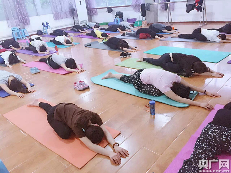 健身房內(nèi)學(xué)員跟隨老師在進(jìn)行瑜伽課程 圖片來自大秦之聲