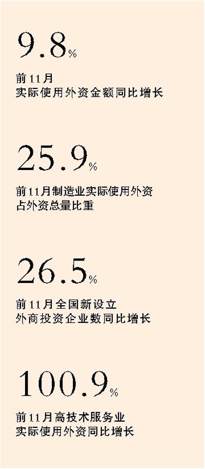 利用外資帶動產業轉型升級步伐加快。前11月,制造業尤其是高技術業吸收外資延續良好增長態勢。高技術制造業實際使用外資601.5億元人民幣,同比增長9.9%,其中,計算機及辦公設備制造業、醫療儀器設備及儀器儀表制造業同比分別增長42.7%和27.8%。高技術服務業實際使用外資1771億元人民幣,同比增長100.9%,其中,信息服務、科技成果轉化服務實際使用外資同比分別增長167.1%和40.5%。