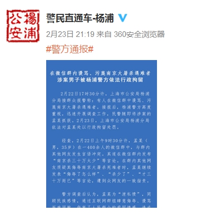 據(jù)上海市公安局楊浦分局官方微博消息,2月22日17時(shí)30分許,上海市公安局楊浦分局接群眾報(bào)警稱(chēng):有人在微信群中謾罵、污蔑南京大屠殺遇難者。接報(bào)后,楊浦警方高度重視,迅速開(kāi)展調(diào)查工作,民警隨即將涉案的孟某抓獲。2月23日,上海市公安局楊浦分局依法對(duì)孟某處以行政拘留處罰。