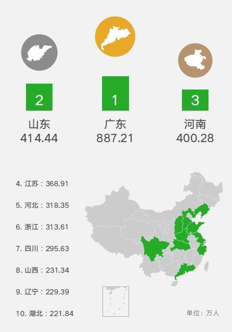 出行人數最多的省份依次為:廣東,山東,河南,江蘇,河北,浙江,四川,山西,遼寧,湖北。