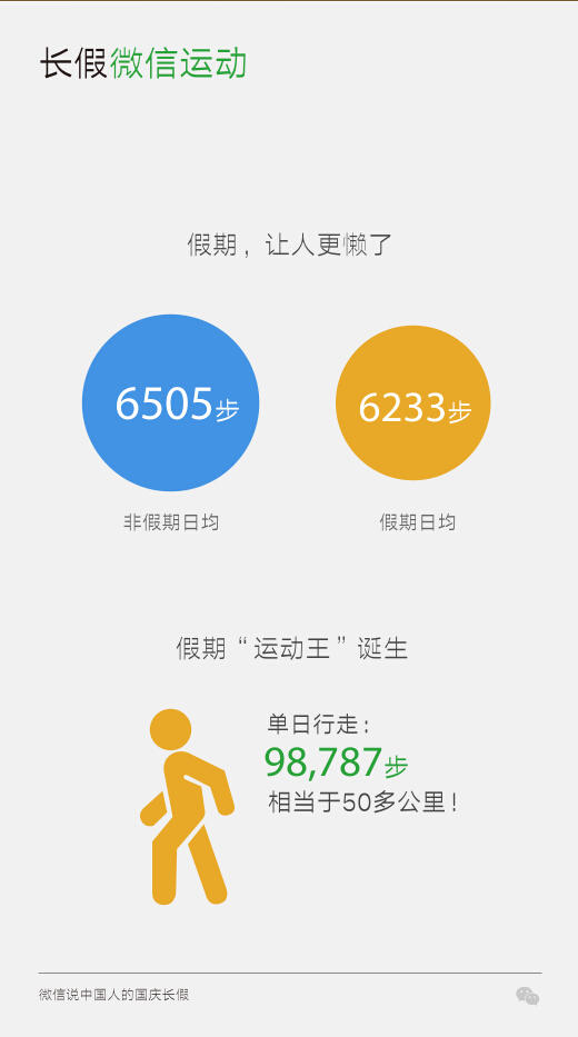 國慶長假對于很多人也是個刷微信運動的好時候。不過和非假期相比,假期的平均步數實際上減少了約200步。但是,有用戶在一天之內走的步數達9.8萬步,如果按每小時走6000步算,相當于該用戶馬不停蹄走了16個小時。