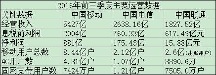 10月22日,中國聯通也公布了2016年前三季度主要運營數據。