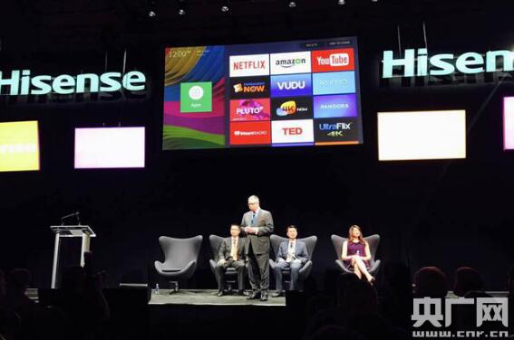 中國家電廠商海信(Hisense)在CES消費(fèi)電子展商發(fā)布會雙色4K激光電視新品。