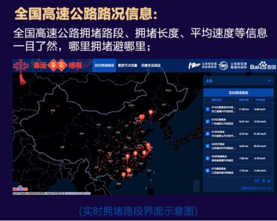 圍繞春運出行高峰,百度地圖除了上線春運系列直播間,還在公安部交管局指導下,與公安部交通管理科學研究所合作開展了2017年春運“平安播報”活動,可為全國用戶提供高速公路路況信息、重要節點流量信息、團霧多發路段信息,以及通過百度地圖APP還可以收到沿途惡劣天氣導致的交通管制信息等語音提示,借助大數據讓用戶平安返鄉。