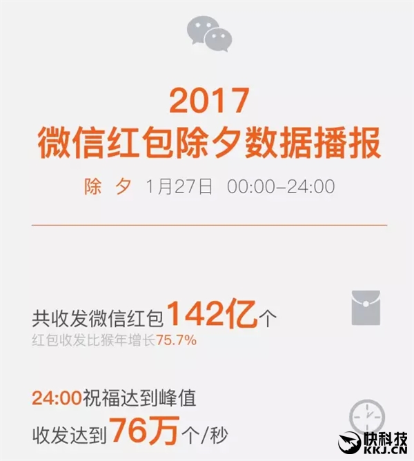 據微信官方數據,1月27日除夕全天,微信紅包共收發多達142億個,比猴年除夕猛增了75.7%。