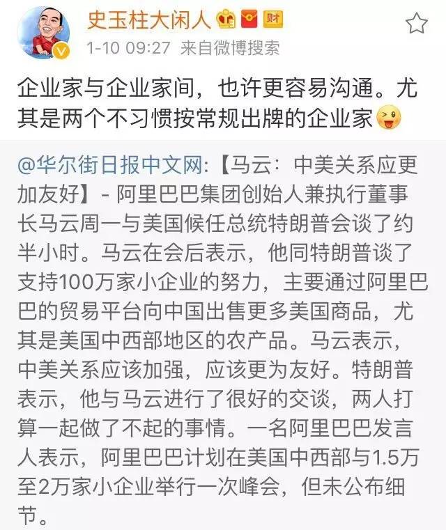 史玉柱最新的微博顯示,他在特朗普會見馬云這個事件上表態:企業家之間也許更容易溝通,尤其是兩個不習慣按常規出牌的企業家。其畫風一如既往地“捧”馬云。