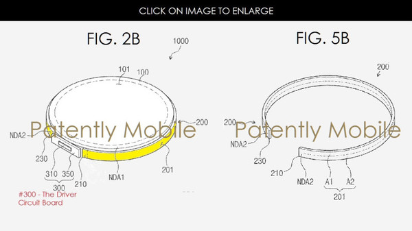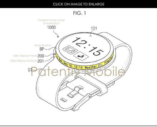 從專利圖中可以看出,這種智能手表的表盤外有一圈環形彎曲屏幕,可以顯示時間、天氣以及當前播放的音樂等。據稱環形彎曲屏幕將被未來的Gear智能手表采用。