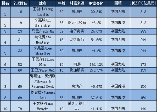 此外,網易CEO丁磊以173億美元排名第六,順豐總裁王衛排名第七,凈資產159億美元。