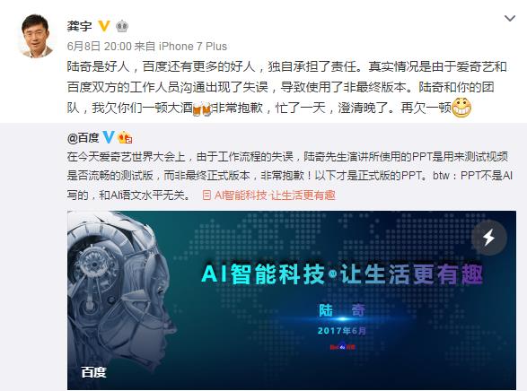 6月9日消息,愛奇藝創(chuàng)始人、CEO龔宇在微博上回應(yīng)了2017愛奇藝世界大會(huì)開幕式主題演講中陸奇的“PPT烏龍事件”,稱百度獨(dú)自承擔(dān)了責(zé)任,而這個(gè)錯(cuò)誤是因?yàn)閻燮嫠嚭桶俣入p方溝通出現(xiàn)失誤。龔宇將陸奇稱之為“好人”,并表示因?yàn)槭д`和回應(yīng)晚了,要請陸奇和他的團(tuán)隊(duì)兩頓大酒。