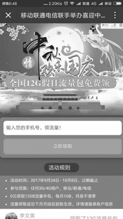 “移動、聯通、電信聯手舉辦喜迎中秋活動,2G流量免費領!”臨近“十一”、中秋長假,這個看似“喜大普奔”的活動刷爆沈陽市民的微信朋友圈,三大運營商聯手發節日“福利”,這活動是真的嗎?