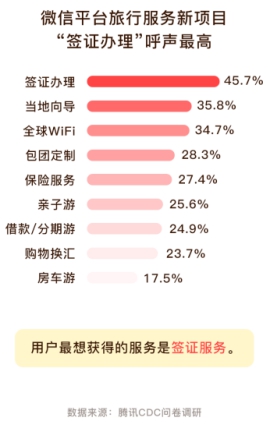 《報告》數據顯示,除了標準化程度較高的交通票務、住宿等旅行產品外,用戶還希望微信平臺(錢包)能夠新增簽證辦理、當地向導、全球WiFi、包團定制、保險、親子游、分期游、購物換匯、房車游等旅行服務(產品)。這表明,微信用戶希望在微信平臺上獲得更加豐富的旅行服務(產品)。
