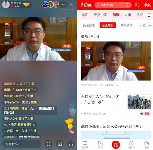 2月6日,“學習強國”學習平臺與快手攜手,邀請相關領域專家、名醫,為全國用戶就疫情防護進行不同主題的科普和答疑。首場直播由上海市肺科醫院副主任醫師胡洋主講,系統地介紹了疫情防護知識并為老鐵們辟謠。快手用戶為胡醫生送出181.35萬個贊。
