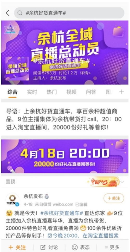 本次#余杭好貨直通車#的宣推充分認識到了流量的重要作用。在直播前,@余杭發布 充分利用微博的巨大聲量進行傳播推廣,再導流到淘寶進行進一步的經濟轉化。作為一個綜合平臺,微博在這個過程中能夠為品牌提供直播前、直播中、直播后期的全流程話題營銷。在微博進行前期宣推,到淘寶進行直播售賣,最后再回到微博進行效果傳播、品牌印象加固,形成了一次直播帶貨活動的完美閉環。