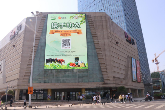位于長沙河西王府井的戶外大屏,滾動播報湘農(nóng)薈與快手攜手助農(nóng)直播的公益海報。
