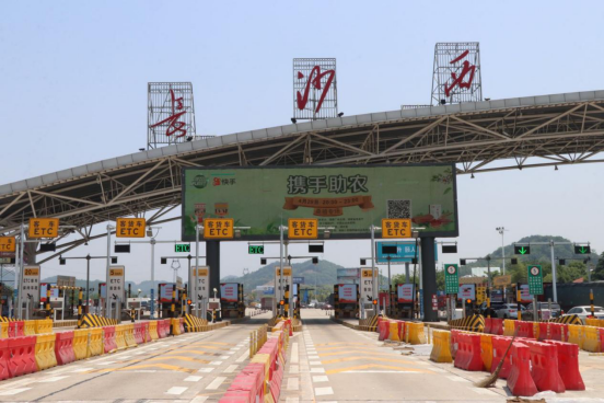 長沙西收費站的LED大屏上,滾動播報湘農(nóng)薈與快手攜手助農(nóng)直播的公益海報。