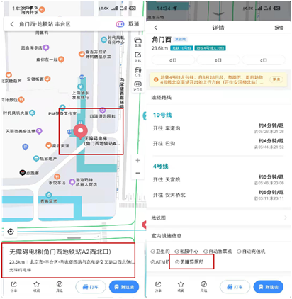 考慮到老年群體出行時可能會使用輪椅等輔助器具,百度地圖還提供了無障礙設施地圖,幫助用戶在行前、行中選擇相應的無障礙設施。用戶只需在搜索框輸入“無障礙電梯”“無障礙洗手間”等關鍵字,即可獲得相關的地點位置信息和導航路線。此外,百度地圖還針對導航解釋話術做了白話處理,防止因南北方文化差異而出現的導航話術理解障礙。