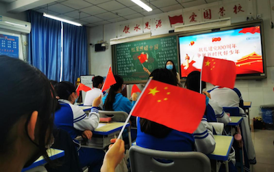 “我和我的祖國,一刻也不能分割,無論我走到哪里,都流出一首贊歌。”班會的最后一個環(huán)節(jié),學(xué)生們揮動手中的國旗,一起唱響《我和我的祖國》,表達(dá)對黨和祖國的深情與熱愛。