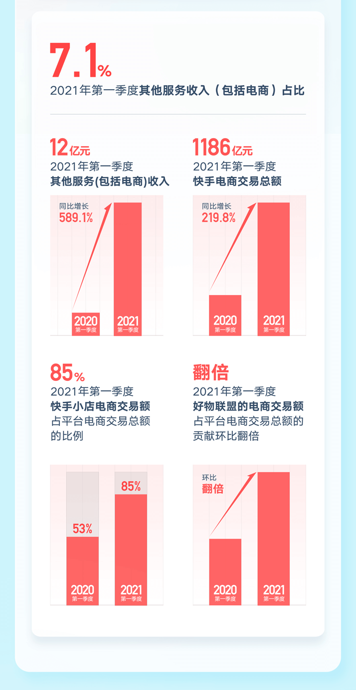 5月24日,快手科技(1024.HK)發布2021年第一季度財報,電商業務增長迅速。其中電商交易總額同比增長219.8%達到人民幣1186億元,私域對電商交易總額的貢獻遠超公域。以電商為主的其他服務收入板塊,同比大幅增長589.1%至人民幣12億元。