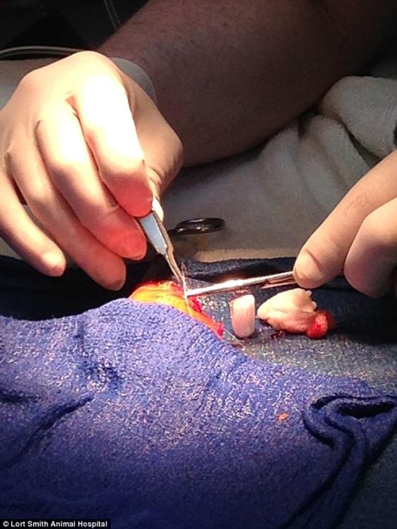 據《每日郵報》2014年9月15日報道,澳大利亞Lort Smith動物醫院提供的圖片顯示,醫生正在給一條10歲的金魚做腦瘤手術。這條金魚名為George。主刀醫生Tristan Rich描述這一長達45分鐘的手術是高難度的,金魚一直服用著含有麻醉的水。(網頁截圖)