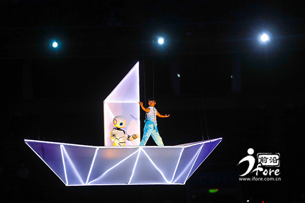 7月底,潘天順正式進組訓練,每天訓練七八個小時,從那時起他有了一個新的稱呼——“津娃”,很多熟悉他的工作人員甚至不知道他的名字,漸漸地他也就習慣了人們這么叫他。開幕式中“津娃”第一次出場需要吊威亞,聽說要吊威亞潘天順興奮不已,直到真的被游絲吊在15米的空中左搖右晃嚇得哇哇大叫的時候,他才知道沒那么簡單。威亞訓練讓潘天順記憶猶新,吊威亞的游絲很軟,他不僅要在威亞上掌握平衡避免左右擺動,還要完成導演要求的指定動作。他每次要在威亞上呆30到40分鐘,每天四五個小時被吊在高空,胯部和腰部經常被威亞裝備勒出淤青。潘天順的指導老師魏珊珊告訴“津云”-前沿新聞記者,不管多苦、多累,他從來都不抱怨,每次都是老師主動問他,是不是累了,是不是需要休息。