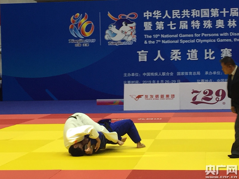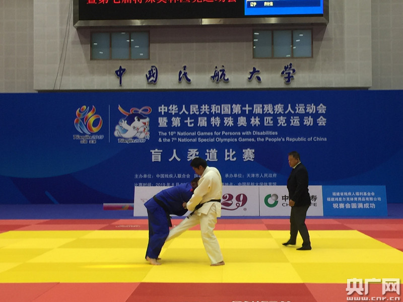 央廣網天津8月31日消息(記者褚夫晴)藍色的地板,紅黃相間的地毯,聲浪滾滾的助威聲。8月29日,在中國民航大學體育館的賽場中央,經歷了4分05秒的加時后,江西隊的馮斌與遼寧隊的齊計龍結束了全國第十屆殘運會暨第七屆特奧會盲人柔道男子81公斤級以上無差別級銅牌賽的爭奪。