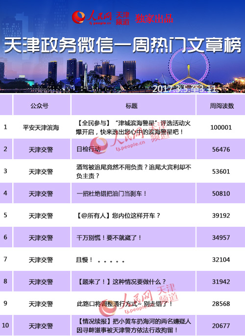 本期排行榜中,前十名的政務類微信公眾號依次為“天津交警”、“平安天津濱海”、“平安天津”、“濱海發布”、“濱海青年”、“寶坻交警”、“美麗紅橋”、“網信天津”、“天津氣象”、“平安塘沽”。