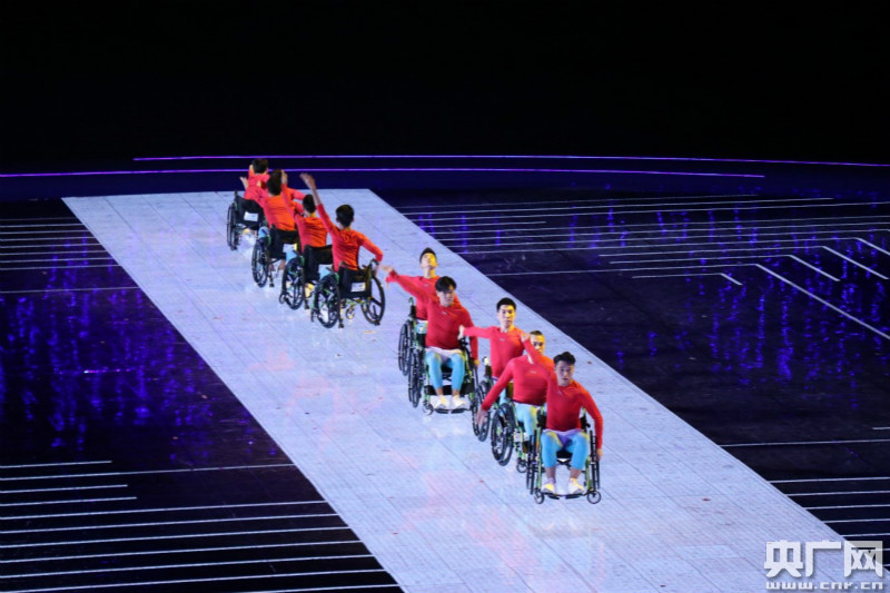 開幕式于當(dāng)晚20時正式開始。在護(hù)旗手的護(hù)衛(wèi)下,中華人民共和國國旗、殘運會會旗、特奧會會旗分別入場。隨后裁判員代表方隊和35個代表團(tuán)的殘疾人運動員代表依次入場。