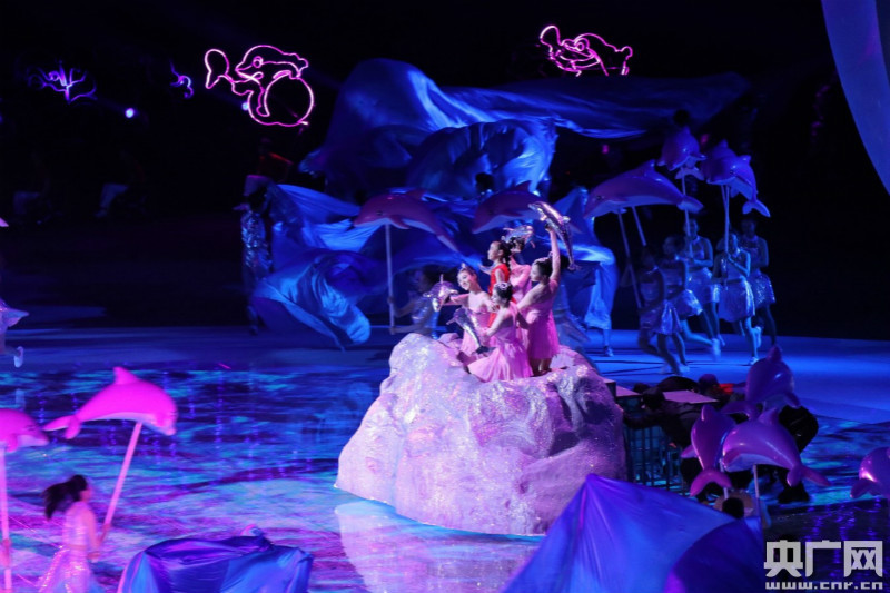 “5、4、3、2、1”伴隨著倒計時,開幕式文體展演拉開帷幕。一位身著紅色衣服的盲女在“小海豚”的幫助下重獲自信。碧波海浪過后,第二個展演作品殘疾人運動員用競速方式展現(xiàn)了頑強(qiáng)拼搏、不屈不撓的體育精神。開幕式文體展演主題為《擁抱陽光》,共分為四個篇章,講述一個讓人內(nèi)心感動而嘴角上揚的溫暖故事。故事從“同沐陽光”勇敢的開始,以“生命陽光”深情的歌詠,借“共享陽光”相互支撐,最終贏得生命的褒獎,讓信念與勇敢織就出“擁抱陽光”。開幕式參演演員800余人,其中包括殘疾人演員、高校演員和專業(yè)院團(tuán)演員。