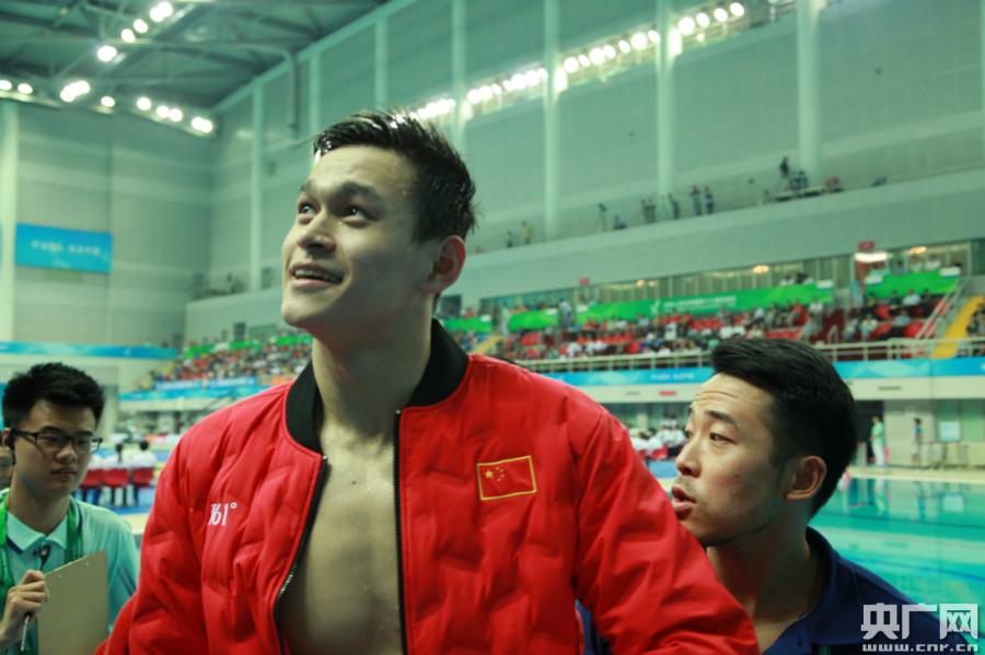 央廣網(wǎng)天津8月31日消息(記者劉陽 褚夫晴)31日晚,天津奧林匹克體育中心跳水游泳館內(nèi)歡聲雷動,連續(xù)四次征戰(zhàn)全運會的孫楊在男子400米自由泳決賽中順利實現(xiàn)全運三冠王,以3分41秒94的成績奪得金牌,山東隊的季新杰和上海的邱子傲以3分47秒52和3分49秒52的成績分獲二三名。