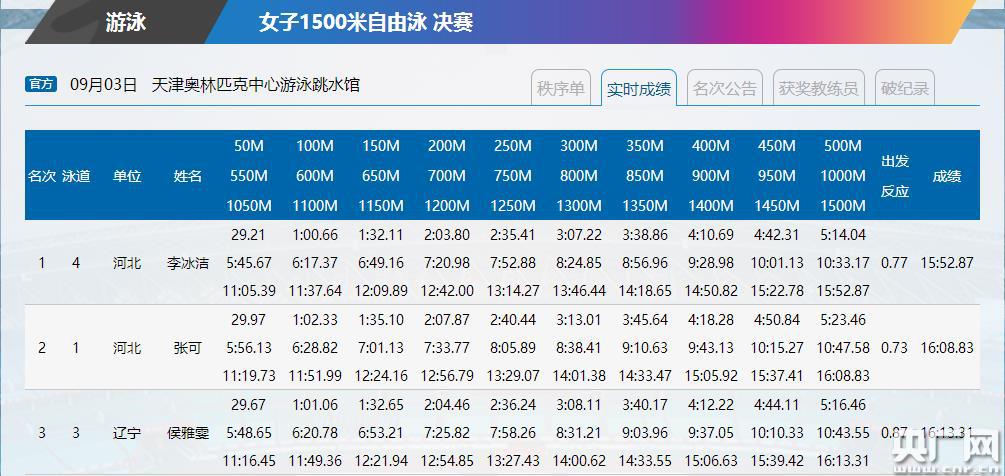 2017天津全運會女子1500米自由泳決賽,年僅15歲的河北小將李冰潔以15分52秒87的成績奪冠,這一成績也打破了亞洲紀錄!這是李冰潔在本屆全運會上取得的第二枚金牌。同樣來自河北的張可獲得銀牌,遼寧選手侯雅雯獲得銅牌。