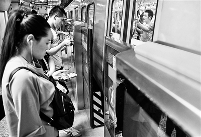 北青報記者在半個小時的時間內觀察,乘客都在屏蔽門前較為有序地候車,沒有發生搶上搶下行為。