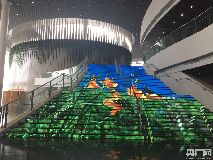 除了穹幕影院,演藝中心的設計也結合了諸多高科技元素。“十一”之后市民走入其中,會看到一個“發光樓梯”,這是演藝中心的一大特色。該樓梯為LED顯示屏樓梯,3部分共37級臺階,可分別顯示圖像也可合成一個屏幕播放,既可以顯示各種文字、圖片、視頻,也可以與現場攝像機無縫聯接,實況直播,效果令人耳目一新。